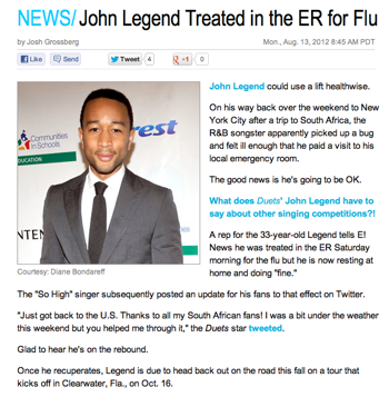 Singer John Legend had the flu this week. After flying to New York City on an international flight, Legend didn’t feel so well, so he went to the hospital to get checked out. Now he’s fine.